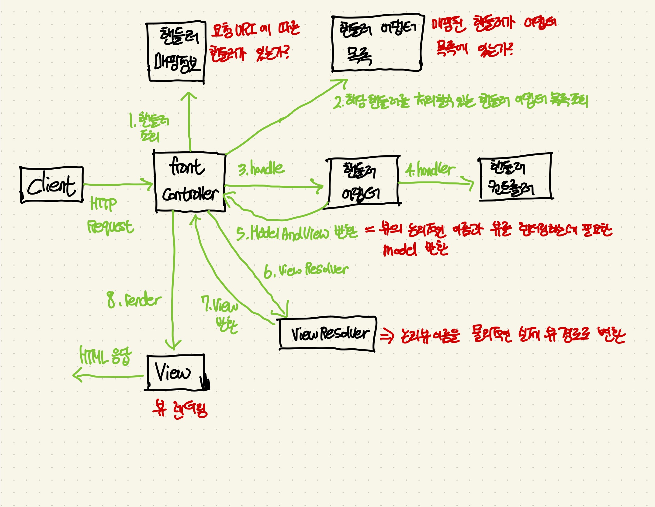 스프링 MVC의 내부 동작원리에 대해서 공부해보았다. 스프링 MVC 는 프론트 컨트롤러 패턴과 어댑터 패턴을 사용해서 필요한 부분만 사용할 수 있게 유연하게 HTTP 요청을 처리하고 응답한다. 오늘은 HTTP Message Body에 JSON 형식과 같은 결과값을 반환하는 방식이 아닌 뷰를 렌더링을 해서 사용자에게 화면을 보여주는 FrontController 패턴을 공부하였는데, 동작원리는 대략적으로 공부하면서 그린것을 바탕으로 보면 다음과 같다.